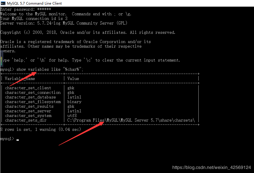 打开MYSQL 客户端 ,输入 show variables like "%char%"; 查找MYSQL的安装路径;