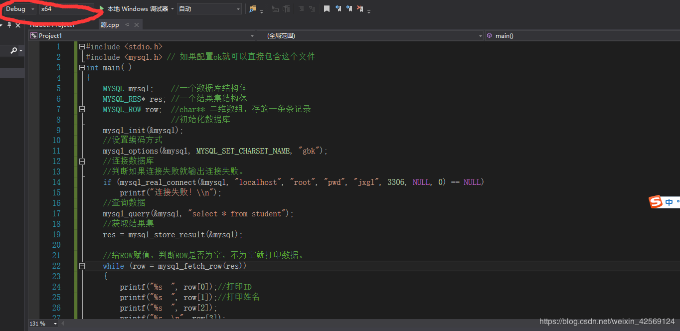 问题出现在这里,我们是在:Debug x64 平台下添加的include和lib文件路径以及libmysql.lib,但是我们工程环境运行在Debug X86 下,如下图红色部分: