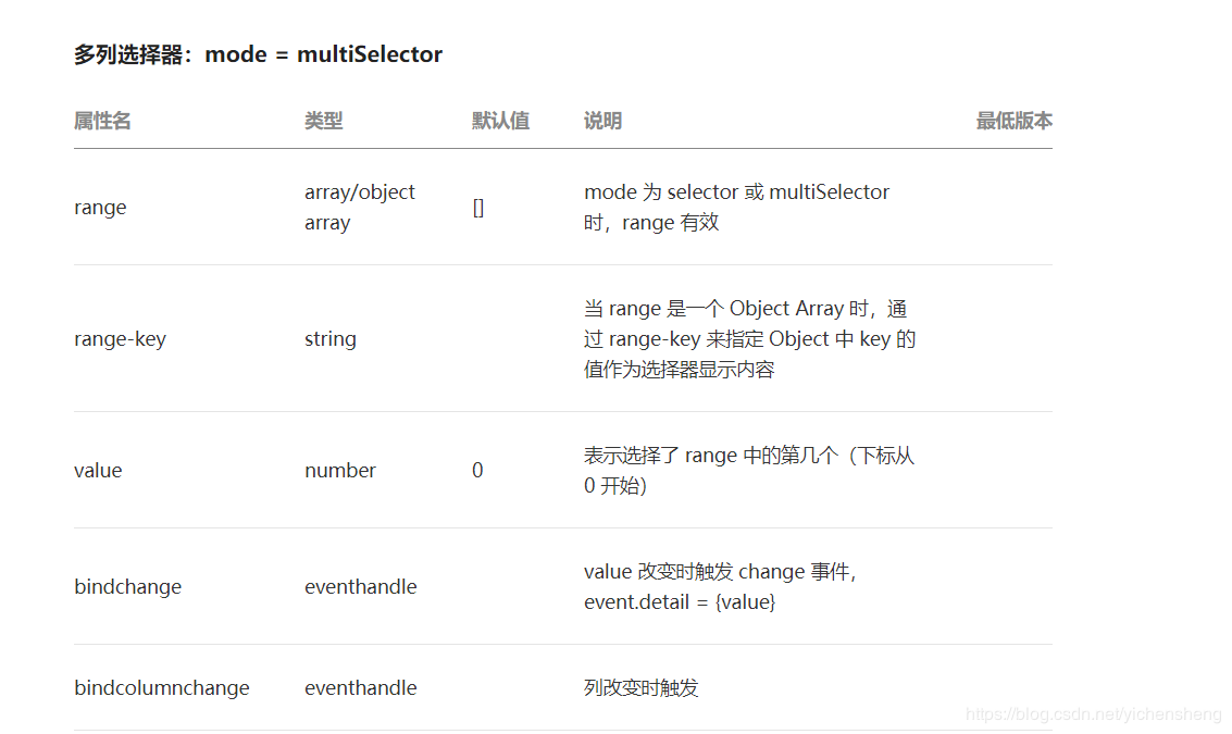 一个简单地多列选择器只要给picker组件加属性mode="multiSelector"即可,绑定数据时使用range来绑定一个数组作为显示内容,下面是官方给出的属性解释。