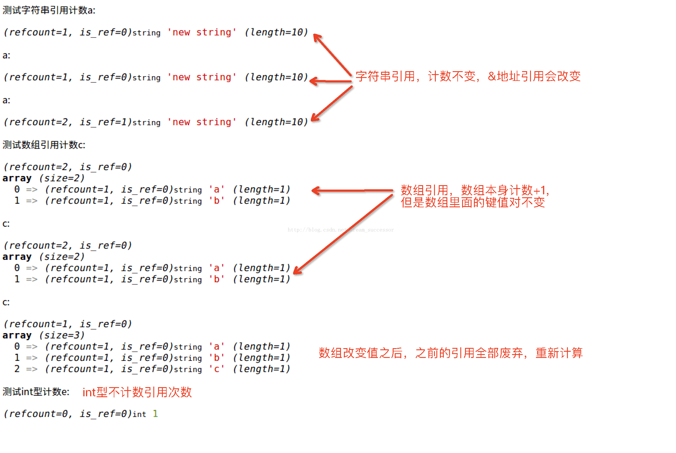 ③对于字符串,未被引用的变量被称为“实际字符串”。而那些被引用的字符串被重复删除(即只有一个带有特定内容的被插入的字符串)并保证在请求的整个持续时间内存在,所以不需要为它们使用引用计数;如果使用了opcache,这些字符串将存在于共享内存中,在这种情况下,您不能使用引用计数(因为我们的引用计数机制是非原子的);