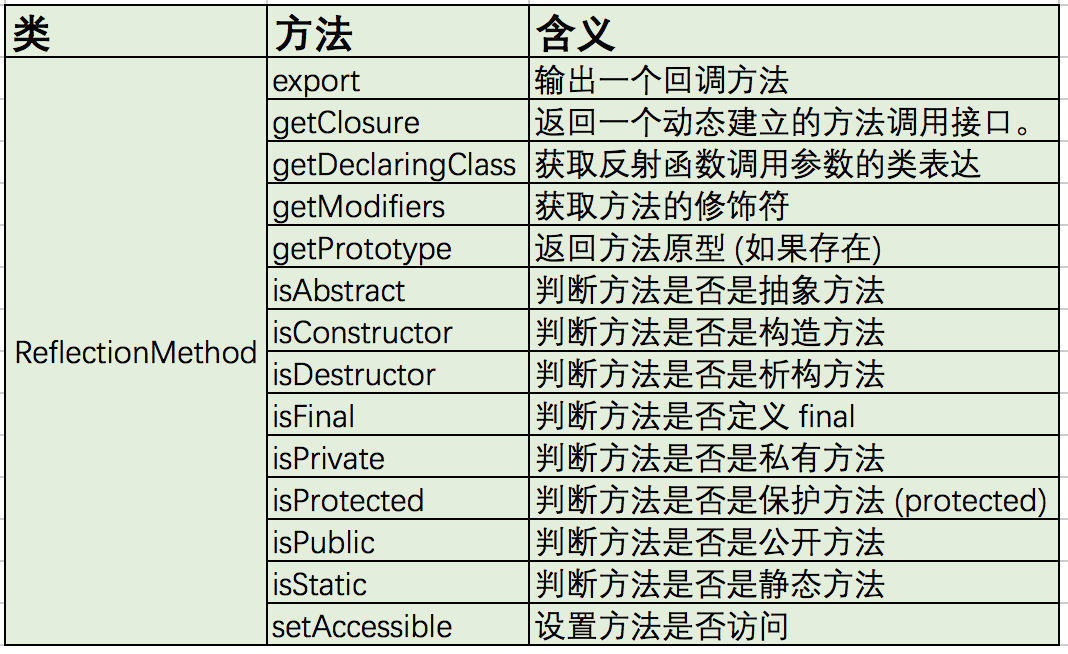 (1) $reflectMethod = new ReflectionMethod(<方法名>);