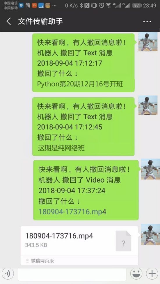 今天的分享就到这里了,需要优化的地方:撤回的视频只支持查看微信自带拍的视频,非微信自带拍的视频打开无法查看。长时间运行时会报 ConnectionError 提示的错误,但是不影响发送撤回消息的功能,后期加个异常捕捉机制优化下。