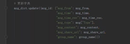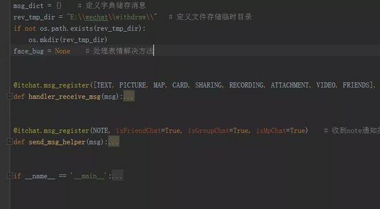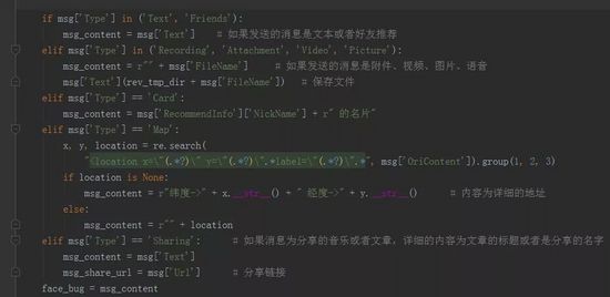 用判断语句对各种类型的消息进行处理,包括文字消息、微信自带的表情和收藏的表情、图片、语音、位置、名片、分享、附件、视频。多条件时这里用了 in 的用法,还记得之前讲Python 优雅的写法文章里把用 or 连接条件改成用 in,代码更简洁,这样我们通过项目不断的巩固之前学到的知识点,这样才能不断进步。