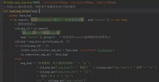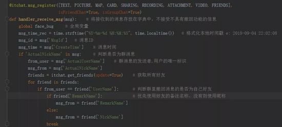 先将我们需要处理的消息用 msg_register 装饰器进行注册,格式化本地时间,定义消息 ID 和消息时间。如果是群成员而且是自己微信好友撤回消息,则显示撤回消息的名称是你备注的名字,如果没有备注名字,则显示名称为微信昵称。