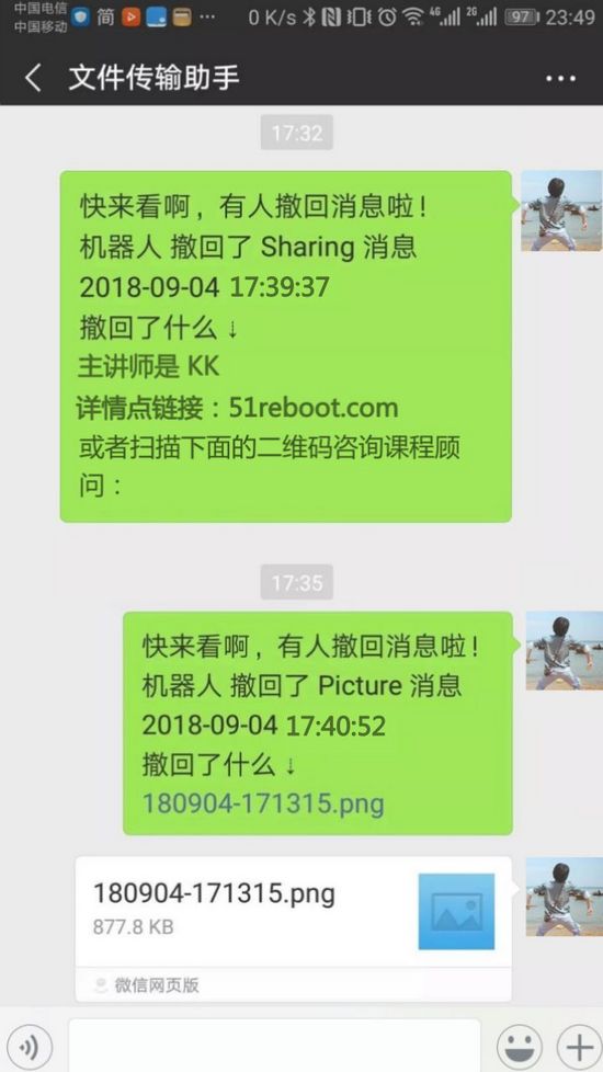 先判断是否是撤回消息,将撤回消息发送到你的文件传输助手里,把上面函数储存的消息的发送人、发送类型、发送时间、撤回的内容发出来。以下是部分代码。