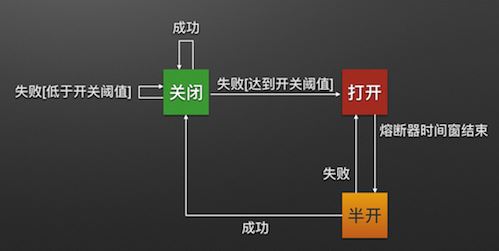 熔断器模式就像是那些容易导致错误的操作的一种代理。这种代理能够记录最近调用发生错误的次数,然后决定使用允许操作继续,或者立即返回错误。熔断器就是保护服务高可用的最后一道防线。 熔断器开关相互转换的逻辑如下图: