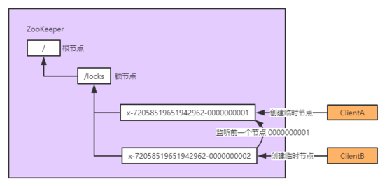 ZooKeeper 分布式锁是基于 临时顺序节点 来实现的,锁可理解为 ZooKeeper 上的一个节点,当需要获取锁时,就在这个锁节点下创建一个临时顺序节点。当存在多个客户端同时来获取锁,就按顺序依次创建多个临时顺序节点,但只有排列序号是第一的那个节点能获取锁成功,其他节点则按顺序分别监听前一个节点的变化,当被监听者释放锁时,监听者就可以马上获得锁。