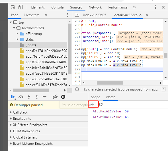 Watch中点“+”,然后点击回车即可,看到对应数据的值。