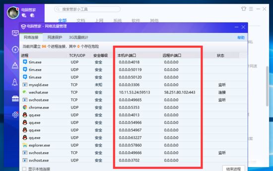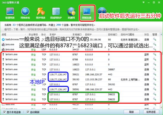 这篇博文和分类看似没有多大关系,但是也是从上一篇衍生出来的产物,因为涉及到 FQ工具 Lantern ,就算是给关注和支持的小伙伴们拓展一下眼界和知识面。而且好多人都阅读了上一篇没发现那个参考博客点不开吗?那是因为还没来的急,整理和编写,今天再试一下就可以。 一个软件可能占用多个端口拥有多个目标IP,下面以FQ工具 Lantern 为例,说明端口查看方法: 1.借助第三方软件查看 如果你电脑上安装了360等优化工具,可能会自带查看网络状况的插件如下图: