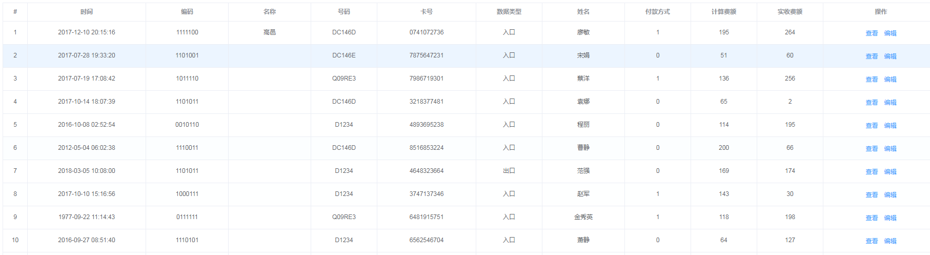 <el-table :data="tableData" border size="mini" fit highlight-current-row height="500"> <el-table-column type="index" align="center" fixed></el-table-column> <el-table-column prop="DHM" min-width="140px" label="时间" align="center"></el-table-column> <el-table-column prop="PLAZANO" min-width="100px" label="编码" align="center"></el-table-column> <el-table-column prop="PLAZANAME" min-width="100px" label="名称" align="center"></el-table-column> <el-table-column prop="CAR_PLATE" label="号码" align="center"></el-table-column> <el-table-column prop="CARD_NO" min-width="120px" label="卡号" align="center"></el-table-column> <el-table-column prop="DATATYPE" label="数据类型" align="center" :formatter="formatDATATYPE"></el-table-column> <el-table-column prop="STAFFNAME" min-width="100px" label="姓名" align="center"></el-table-column> <el-table-column prop="MEDIATYPE" label="付款方式" align="center"></el-table-column> <el-table-column prop="COMP_CASH" label="计算费额" align="center"></el-table-column> <el-table-column prop="FACT_CASH" label="实收费额" align="center"></el-table-column> <el-table-column label="操作" min-width="140px" align="center"> <template slot-scope="scope"> <el-button @click="handleClick(scope.row)" type="text" size="small">查看</el-button> <el-button type="text" size="small">编辑</el-button> </template> </el-table-column> </el-table>