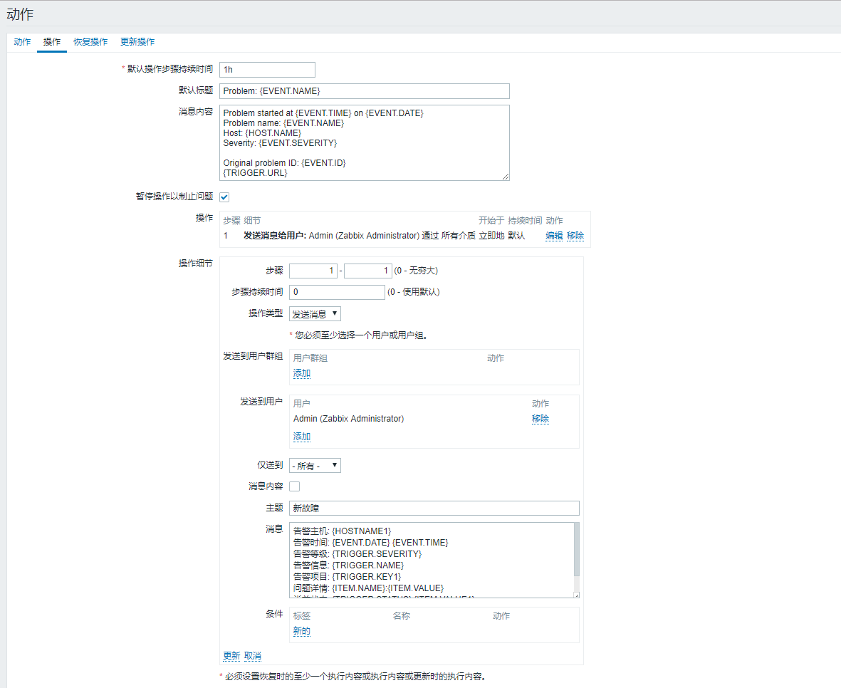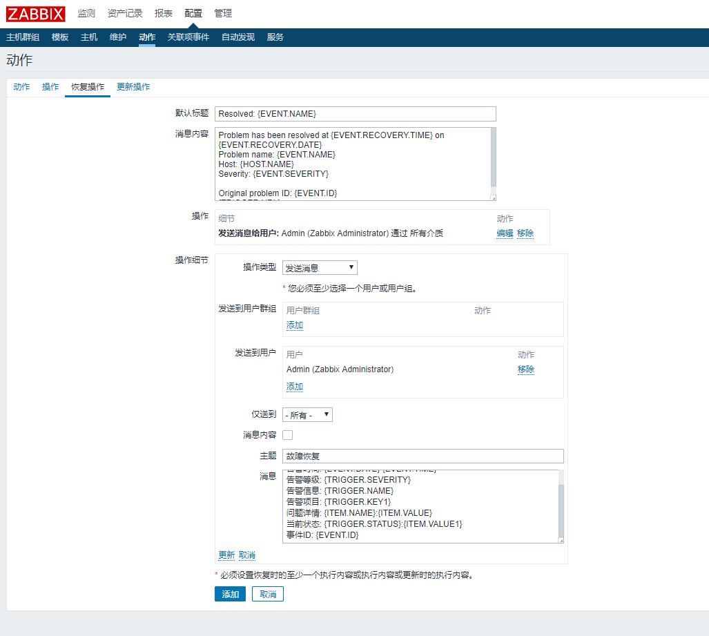 配置动作中需要执行的动作(发送消息给管理员)