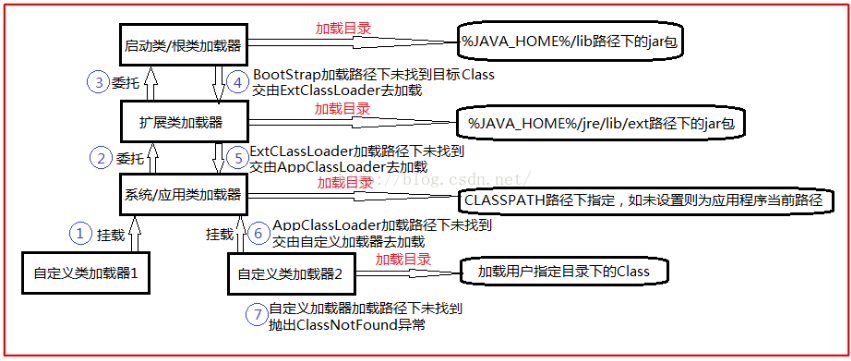 不考虑自定义类加载器,可以看到,启动、扩展、应用这三个加载器就像是爷爷,爸爸,儿子一样的关系,所以要加载一个类的话,选用哪个类加载器呢?肯定是有什么好吃的先让儿子吃呀,然而儿子又很有孝心,会把到手的好吃的给爸爸吃。爸爸又会给爷爷吃,爷爷会尝试着吃,假如一看这东西糖分太高于是就又给爸爸吃,爸爸也尝试着吃,发现这东西不好吃,于是最后还是给儿子吃....这就是类加载器的双亲委托机制,随便找了一幅图看看: