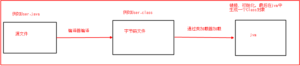 大家知道一个类加载到jvm大概是经过了几个步骤的吧!编译成字节码文件,加载,链接(验证,准备,解析),初始化....,我就简单的用下面这个图一起看看;