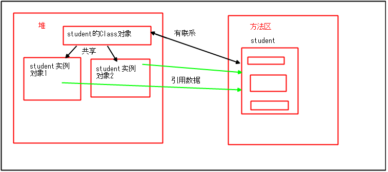 java堆:根据方法区中存的这么丰富的信息,这里就会创建每一个类的Class对象,话说这个Class对象用的最多的就是反射,那么这个Class对象到底是个什么呢?其实不用想的太难理解了,你就把它看作字节码文件在内存中的另外一种形式呗,就好像大米,在电饭煲里的表现形式就是米饭,在高压锅里的表现形式就是粥了.....;假如程序运行的话,还会在堆中创建对象并且存放在堆中,所有的同类型的类的实例对象共享一个Class对象,我也随意画了一个草图来看看如下所示,所以同一个类的不同实例对象的xx.getClass()都是一样的,而且根据获得的Class对象可以利用反射创建新的对象和获取其中的方法,可以说Class对象为我们程序员提供了一个操作堆中对象的一个安全通道