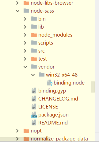 上图node-sass文件夹下,新建 vender 文件夹.然后运行,npm rebuild node-sass --save-dev,之后,查看node-sass文件夹,如下图所示: