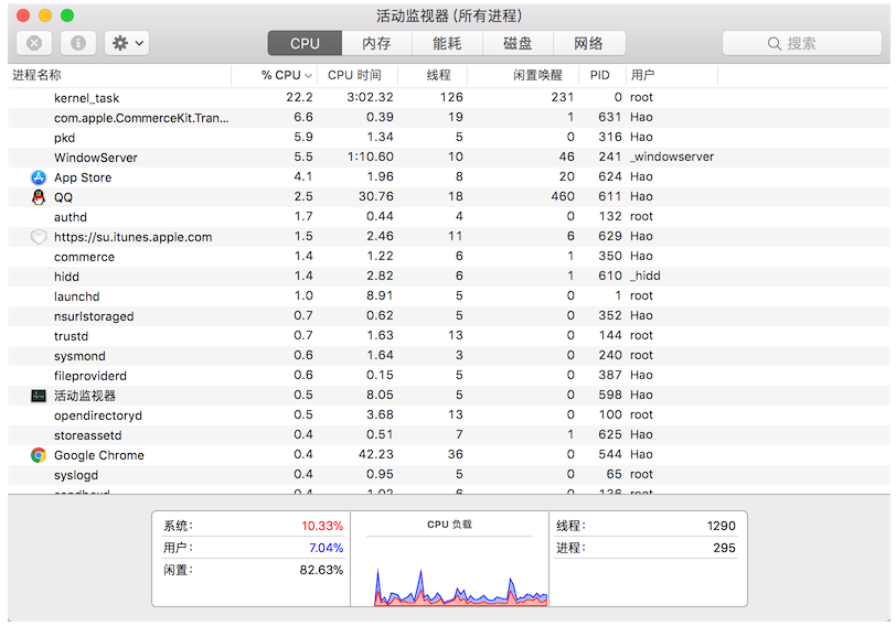 一个进程还可以拥有多个并发的执行线索,简单的说就是拥有多个可以获得CPU调度的执行单元,这就是所谓的线程。由于线程在同一个进程下,它们可以共享相同的上下文,因此相对于进程而言,线程间的信息共享和通信更加容易。当然在单核CPU系统中,真正的并发是不可能的,因为在某个时刻能够获得CPU的只有唯一的一个线程,多个线程共享了CPU的执行时间。使用多线程实现并发编程为程序带来的好处是不言而喻的,最主要的体现在提升程序的性能和改善用户体验,今天我们使用的软件几乎都用到了多线程技术,这一点可以利用系统自带的进程监控工具(如macOS中的“活动监视器”、Windows中的“任务管理器”)来证实,如下图所示。