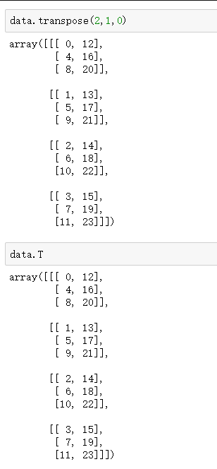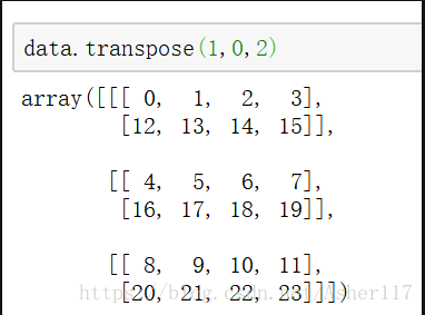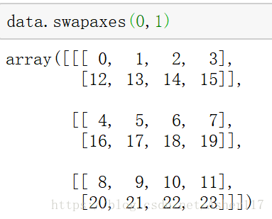 3.两轴对换swapaxes:swapaxes方法接受的参数是一对轴编号,使用transpose方法是对整个轴进行对换,而swapaxes是将参数的两个轴进行对换。刚刚上面的transpose(1,0,2),实际上就是将0和1轴进行对换,因此使用swapaxes也可以实现,如下: