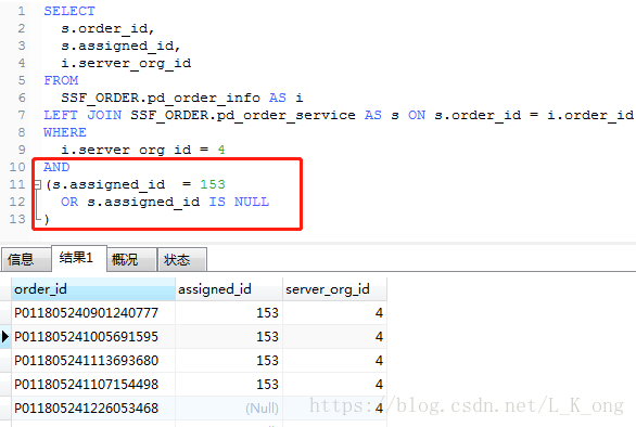 今天有这样得一个需求,如果登陆人是客服的话,会查询订单是'该客服'以及还没有匹配客服的,刚开始想的是直接在sql语句上拼写 or assigned_id is null 的,测试了一下发现这样的话,前面的其他条件都没有用了