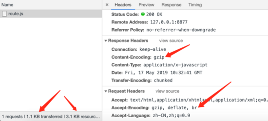 运行 server 可以看到不仅 response header 增加压缩标志,而且 3K 大小的资源压缩到了 1K,效果明显: