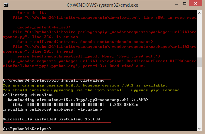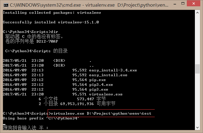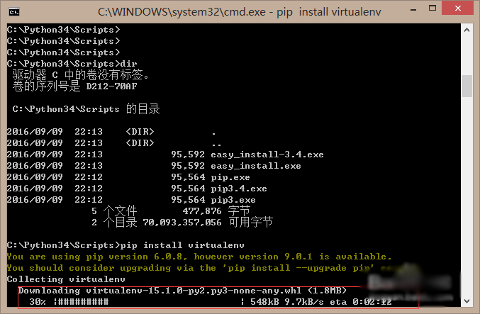 使用pip命令安装虚拟环境,命令为:pip install virtualenv,安装过程截图如下所示,