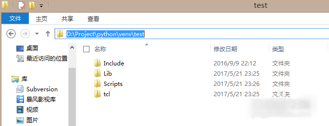安装后的虚拟环境在脚本目录下,创建虚拟环境,命令为:virtualenv D:\Project\python\venv\test,将在D:\Project\python\venv目录下创建名为test的文件夹,test文件夹下的组成如下图所示,