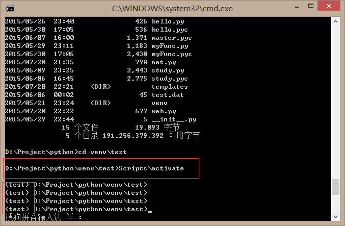 启动虚拟环境,进入虚拟环境目录virtualenv D:\Project\python\venv\test,在此目录下启动命令行界面,运行命令: .\Scripts\activate即启动虚拟环境,启动虚拟环境后在命令行界面下会出现虚拟环境的名称,提示用户已经进入虚拟环境,截图如下所示: