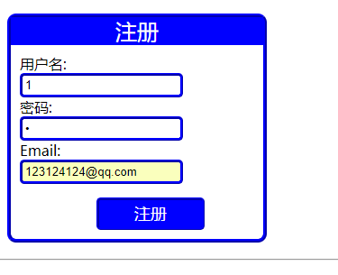 <!DOCTYPE html> <html> <head> <meta charset="UTF-8"> <title>用户注册</title> <link type="text/css" href="/static/css/styles.css" /> </head> <body> <div class="form-container"> <p class="form-header">注册</p> <form method="POST" > <label>用户名:</label> <input type="text" name="username"><br> <label>密码:</label> <input type="password" name="password"><br> <label>Email:</label> <input type="email" name="email"><br> <input type="submit" value="注册"> </form> </div> <hr> <%=msg %> </body> </html>