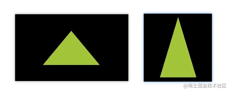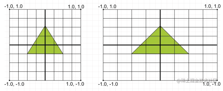 如上图所示,左侧是默认的 OpenGL 坐标系,右侧是 OpenGL 坐标系在 Android 屏幕上的映射,可以明显看到图中的三角形是变形了的,为了保证图像比例就需要应用 OpenGL 投影模式和相机视图来转换坐标,这就涉及到投影矩阵和视图矩阵,这部分内容会在后续的文章中介绍。