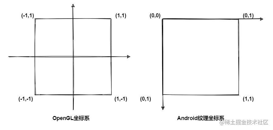先来了解下 OpenGL 的世界坐标系和与之对应的 Android 上的纹理坐标系,如下图所示: