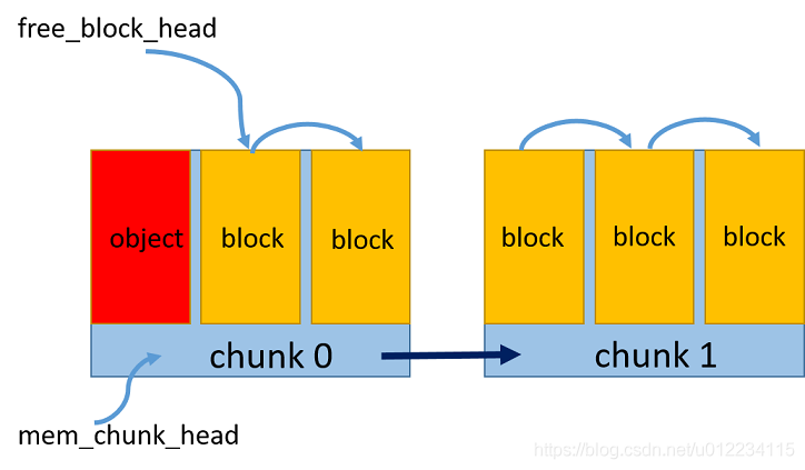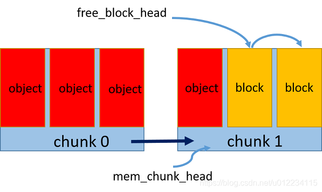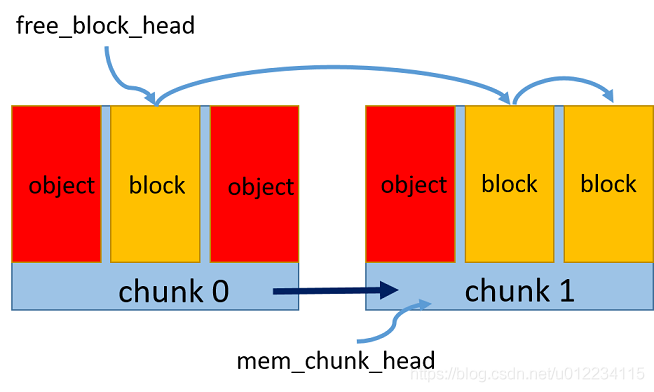 1.预申请一个内存区chunk,将内存中按照对象大小划分成多个内存块block
