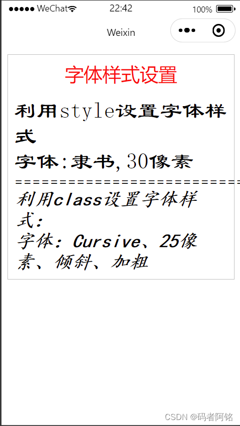<view>字体:Cursive、25像素、倾斜、加粗</view>