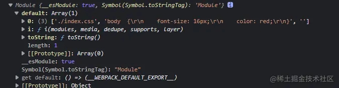 css-loader将目标样式文件转换成一个js对象并导出了该对象,默认属性上有index.css文件的信息。