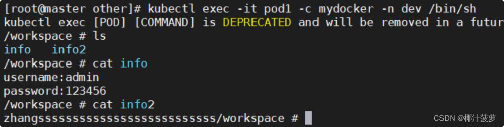 可以看到,因为pod1中是将configmap直接挂载到了容器的workspace目录,由于Linux的目录挂载特性(可以看这篇:什么是挂载,Linux挂载详解),原来的workspace目录下的文件将会被挂载过来的目录下(可以将configmap看成一个目录,因为每个key都是一个文件)的文件所覆盖,因此workspace中只有configmap中的info和info2文件。如果不想被覆盖,则要以文件的方式进行挂载,如pod2.yaml中所示,注意mountPath和subPath的写法,subPath此时指的就是configMap中的key,也就是文件名。
