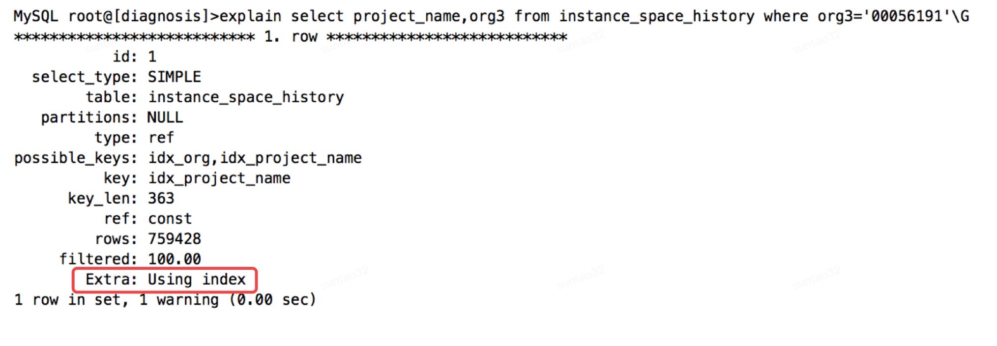 alter table instance_space_history add index idx_org1(org1); 看添加索引后的执行计划