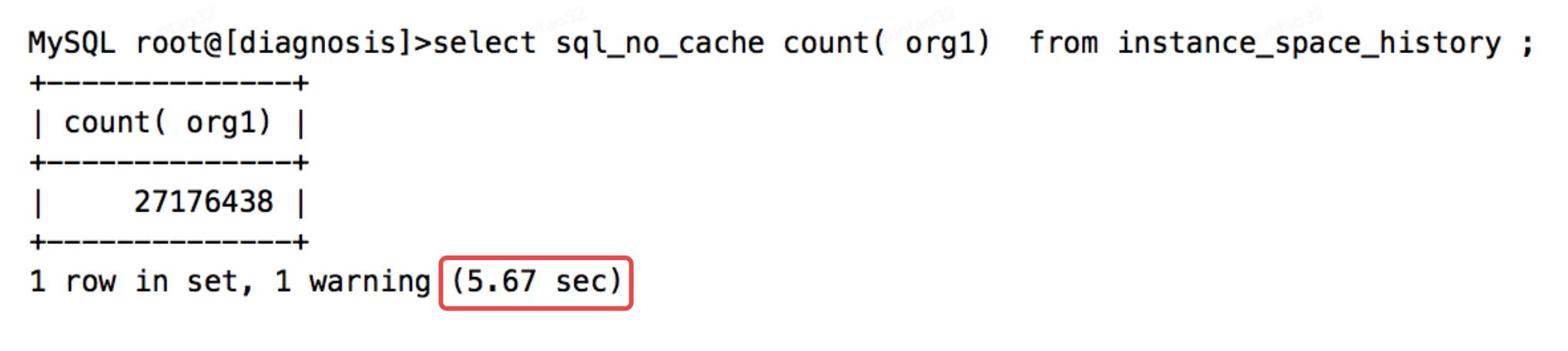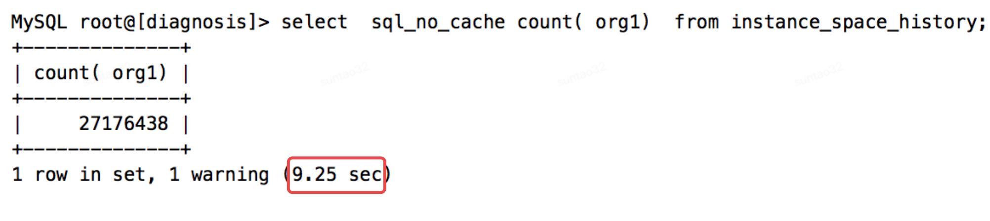 执行计划中,type为ALL,代表进行了全表扫描,扫描行数达到了26274308,所以执行时间为9.25秒,也是正常的。