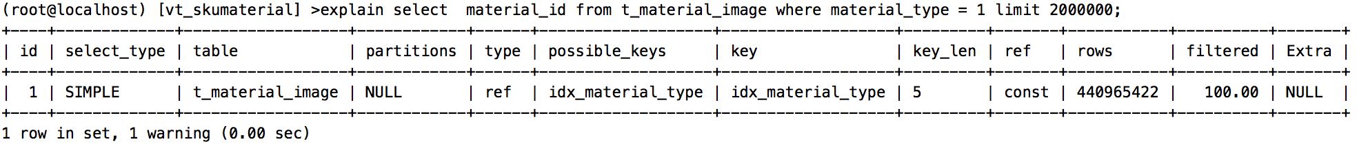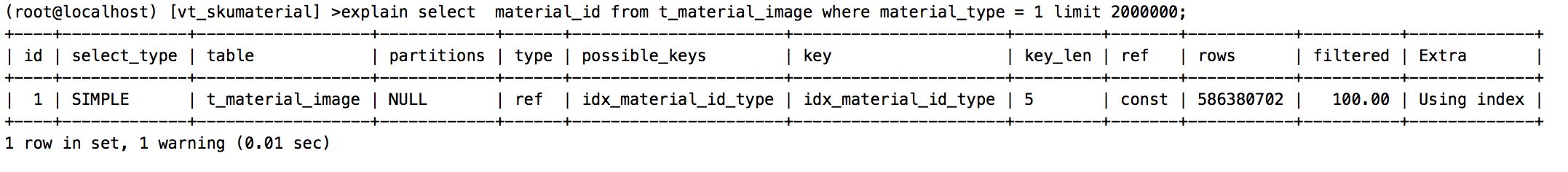 通过执行计划和测试结果看,的确是有效果的,但是走索引后的查询效率依然不能满足我们期望。 然后试着给material_type,material_id添加联合索引。 alter table t_material_image add index idx_material_id_type (material_type,material_id);