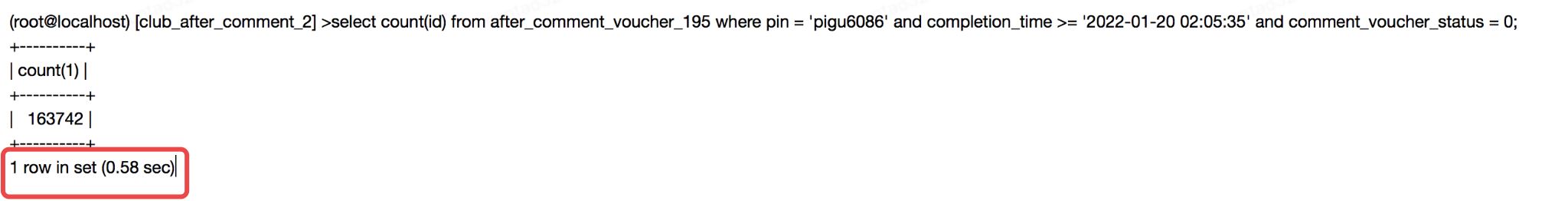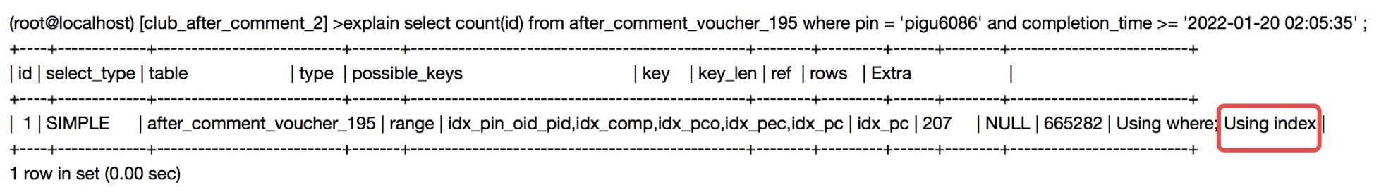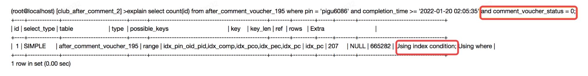 对于Innodb的辅助索引,它的叶子节点存储的是索引值和指向主键索引的位置,然后需要通过主键在查询表的字段值,所以辅助索引存储了主键的值。如果查询所选择的列只有主键,应该考虑通过索引覆盖优化。 看下面的两个sql,字段 pin 和completion_time有联合索引,where条件差别只有comment_voucher_status = 0,但是执行时间差距巨大(第一个sql0.58s,第二个sql0.2s),为什么呢?是不是很困惑