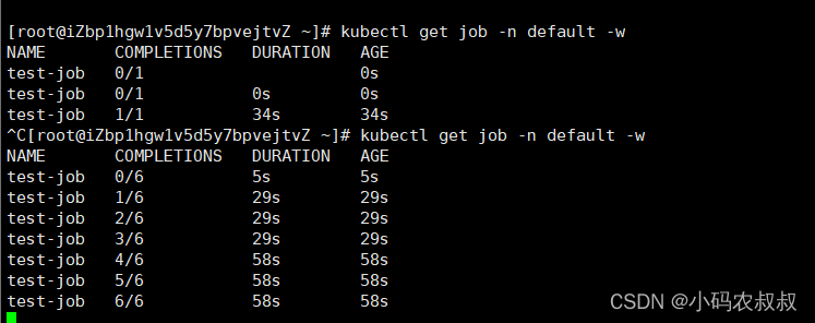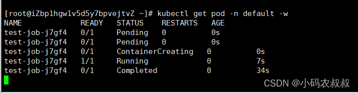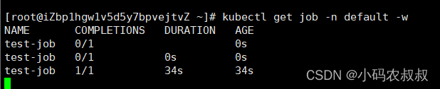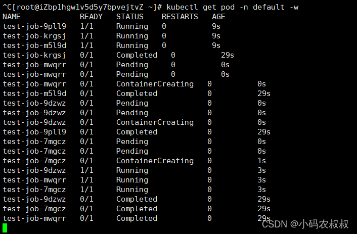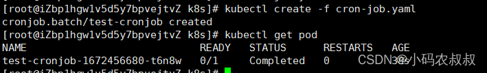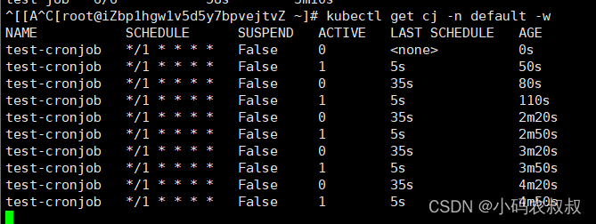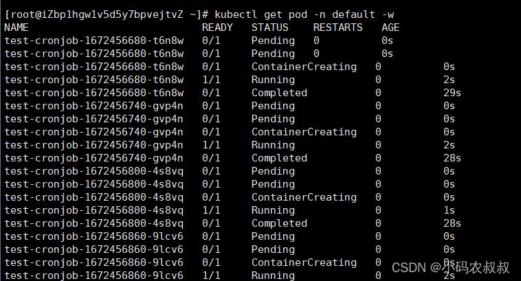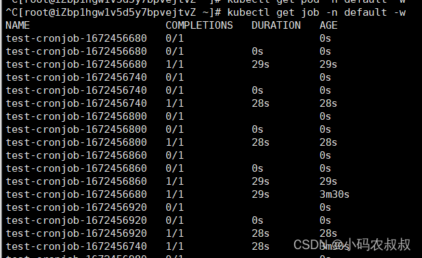 通过开启其他客户端窗口,可以监控cronjob,job以及pod的运行过程中的状态;