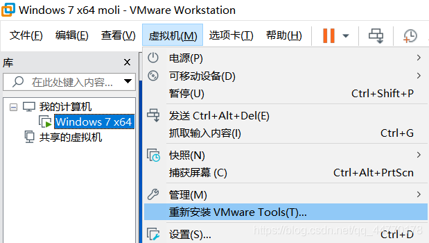 在此之前,我们需要安装好VMware tools,如下图所示,由于我已经安装过了,所以安装的选项显示为重新安装。