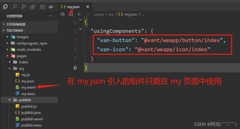 在页面的 json 文件里配置 usingComponents 选项,这种按需引入组件的方式,我暂且称它为局部引入。这种方式,可以减少项目的压力,但是只有当前页面可以使用该组件,其他页面不能使用。