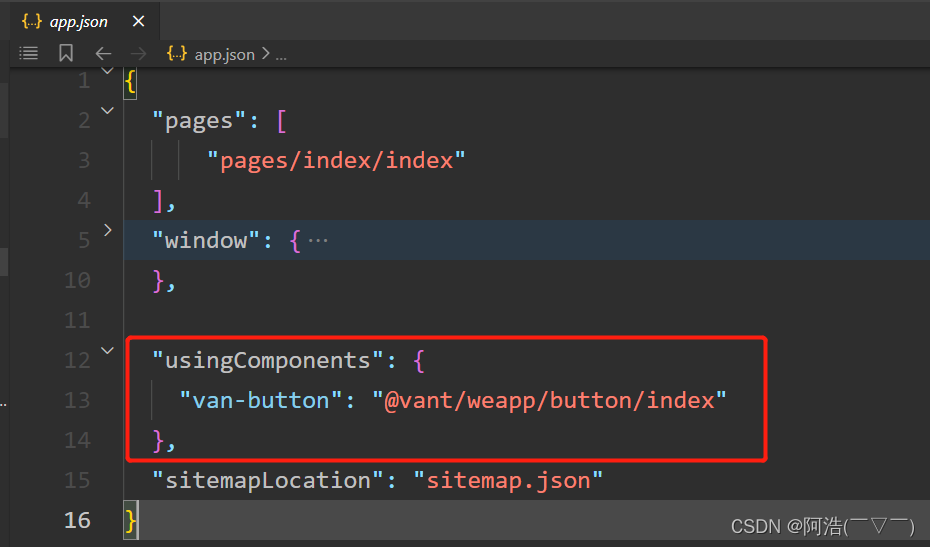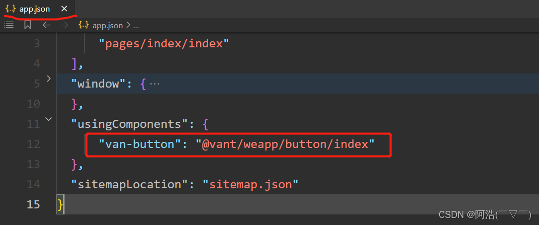 这里涉及到注册组件的两种方式,后面会讲到。下面,以在 app.json 全局注册 button 组件为例: