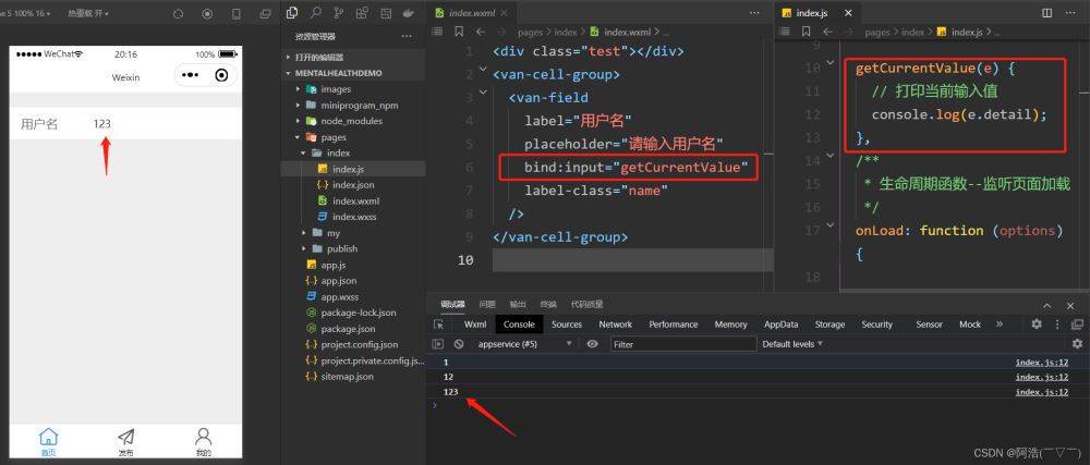 Vant Weapp 给每个组件都提供了一些事件,方便我们实现组件的交互效果。以 Field 输入框为例,我们使用 bind:input 事件来打印当前的输入值。