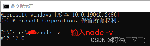 在cmd终端中输入 node -v 后回车显示版本号,表示安装成功!