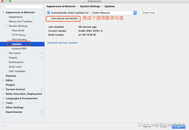2.在系统设置中将更新选项中的“use secure connection” 取消勾选(有的没有下面的选项,直接跳过)