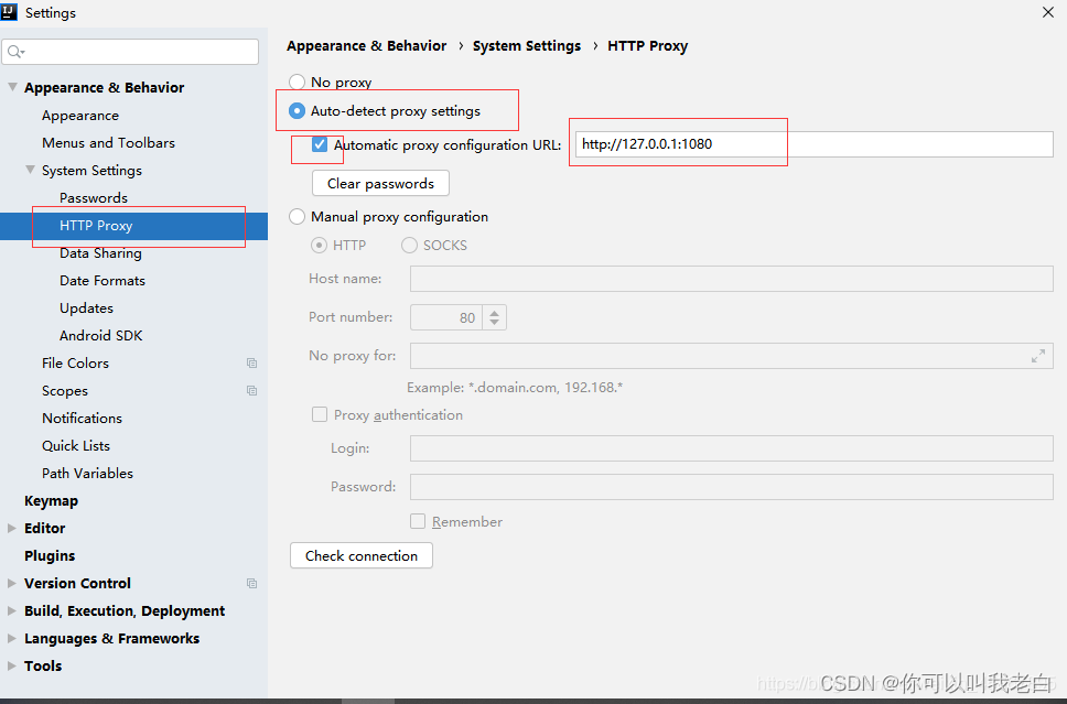 File–>Settings–>Appearance & Behavior–>System Settings—>HTTP Proxy(修改为图片所示)