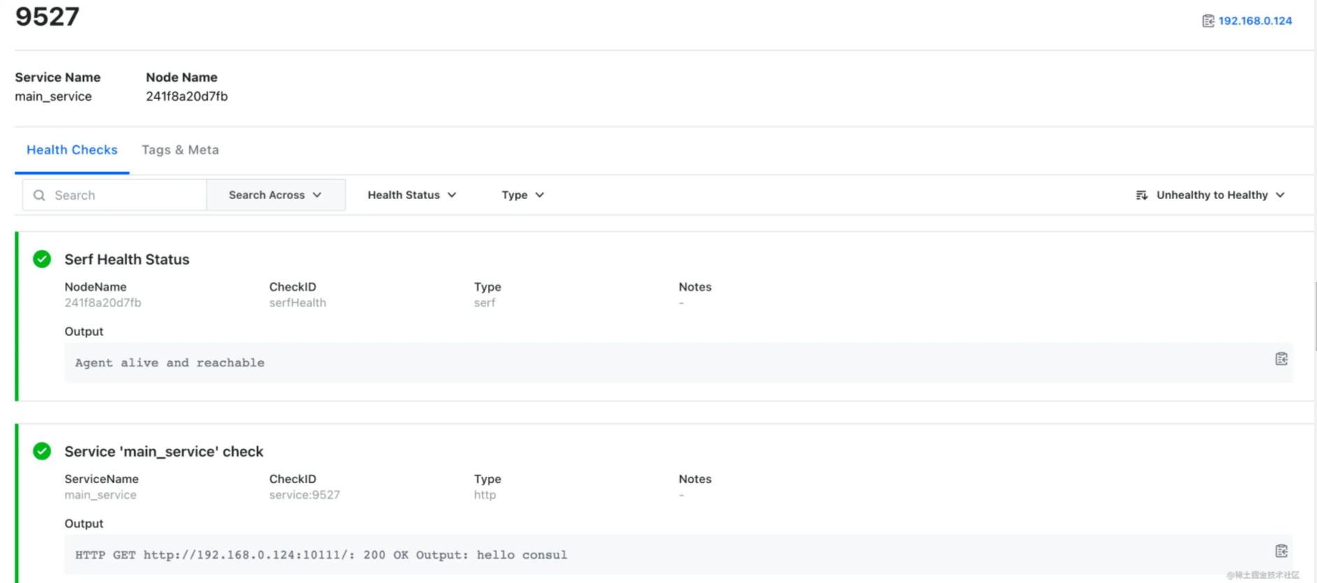 main_test.go:29: the isntance Service is &{Kind: ID:9527 Service:main_service Tags:[a b] Meta:map[] Port:10111 Address:192.168.0.124 SocketPath: TaggedAddresses:map[lan_ipv4:{Address:192.168.0.124 Port:10111} wan_ipv4:{Address:192.168.0.124 Port:10111}] Weights:{Passing:1 Warning:1} EnableTagOverride:false CreateIndex:43 ModifyIndex:43 ContentHash: Proxy:0xc0000c44d0 Connect:0xc000091a50 PeerName: Namespace: Partition: Datacenter:}