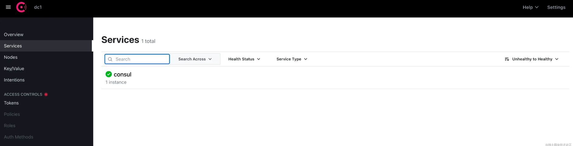 两步启动一个consul的server-agent,然后就可以通过ip:8500访问得到consul的一个web界面,如果ip访问不通可以使用下文的vscode的代理模式去访问或者是在自己厂商的cvm控制台去开端口的访问策略,web界面如下