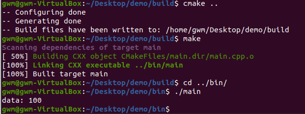 cd到build目录下执行cmake … && make,然后到bin目录下执行./main,可以看到打印为空,