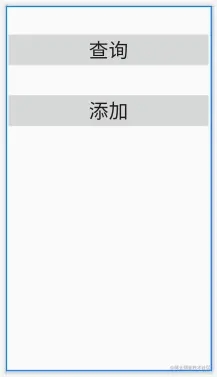 <?xml version="1.0" encoding="utf-8"?> <LinearLayout xmlns:android="http://schemas.android.com/apk/res/android" xmlns:tools="http://schemas.android.com/tools" android:layout_width="match_parent" android:layout_height="match_parent" tools:context=".MainActivity" android:orientation="vertical"> <Button android:layout_width="match_parent" android:layout_height="wrap_content" android:text="查询" android:textSize="40sp" android:layout_marginTop="50dp" android:onClick="clickQuery"/> <Button android:layout_width="match_parent" android:layout_height="wrap_content" android:text="添加" android:textSize="40sp" android:layout_marginTop="50dp" android:onClick="clickInsert"/> </LinearLayout>