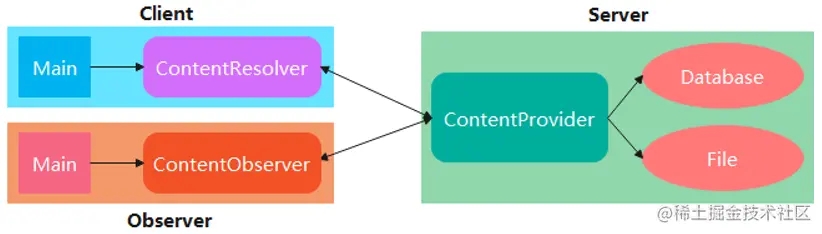 如图,Server 端通过 ContentProvider 对外提供操作本地数据(DataBase、File 等)的接口,Client 端通过 ContentResolver 与 ContentProvider 通讯,从而实现跨进程操作 Server 端数据,Observer 端通过 ContentObserver 监听 Server 端的数据是否发生变化,并触发相关操作。